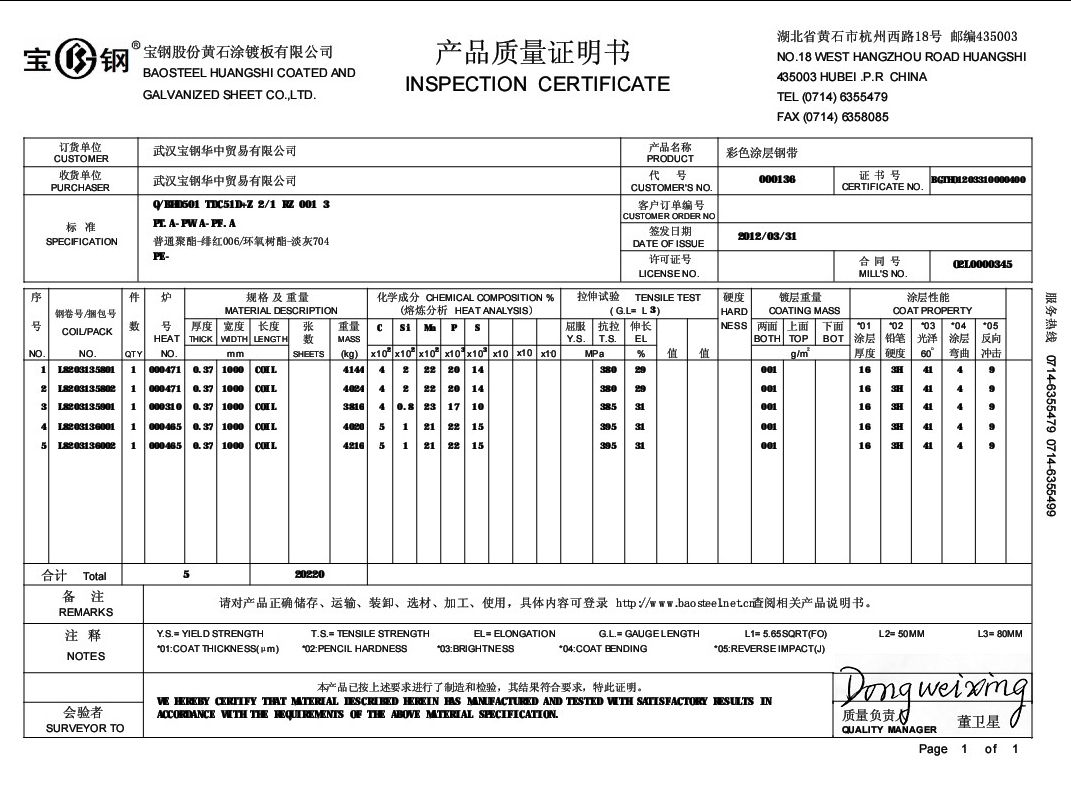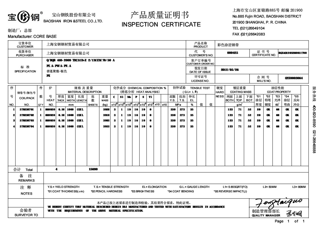 我公司長(zhǎng)期經(jīng)銷上海寶鋼(總部)、寶鋼黃石、臺(tái)灣燁輝、聯(lián)合鐵鋼、馬鋼、澳洲BHP(博思格)等國(guó)內(nèi)外各大鋼廠的:彩涂卷-彩鋼板卷、鍍鋁鋅、熱鍍鋅、冷軋、熱軋、電工鋼等鋼鐵產(chǎn)品。在長(zhǎng)期銷售過程積我們累了豐厚的產(chǎn)品知識(shí)。特別是在如:PVDF氟碳彩鋼卷、HDP高耐候彩鋼板、SMP硅改性彩涂卷、HPC自潔彩鋼板,及抗靜電彩鋼板等高端涂鍍產(chǎn)品方面,有著非常專業(yè)的特長(zhǎng)和深刻研究。